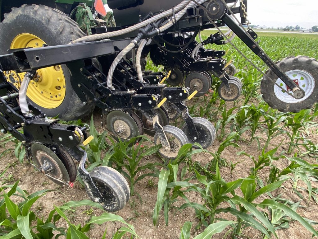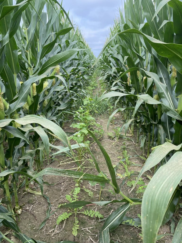Ohio Demonstration Farms project manager, Aaron Heilers checks in on the growth progress of cover crops interseeded into V5 corn at the Kurt Farms demonstration site in Dunkirk, Ohio.